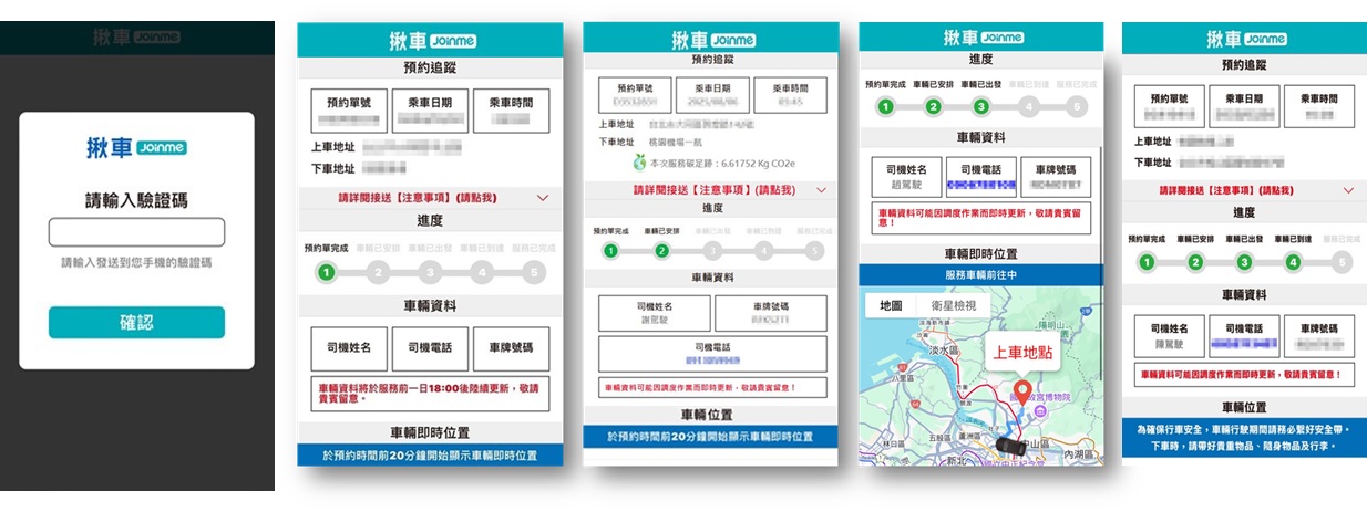 - 服務資訊(車號/司機姓名/聯絡電話)以簡訊提供,於服務前一天18:00後陸續發送;服務當天請保持手機暢通,以利聯繫確認。