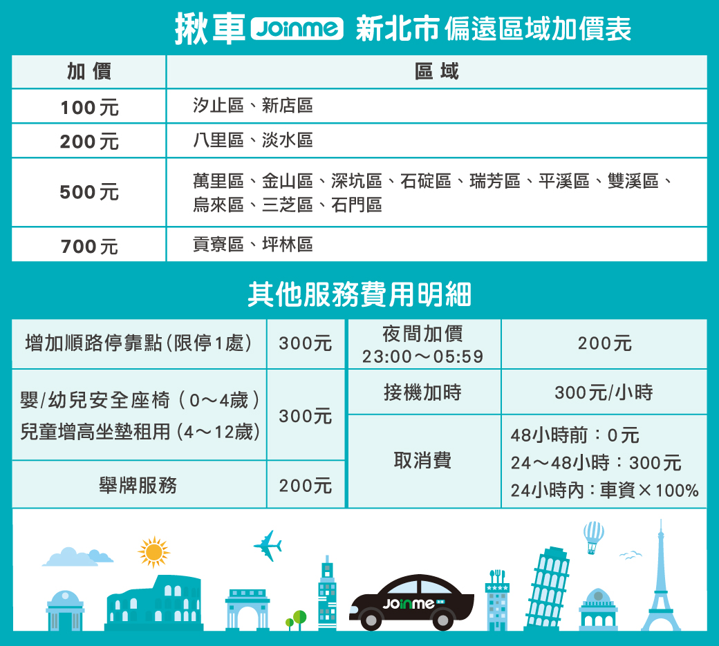 (4) 取消費用說明:若於出發前48至24小時內,取消已預約訂單,將收取300元取消費,24小時內取消,將收取100%車資。
