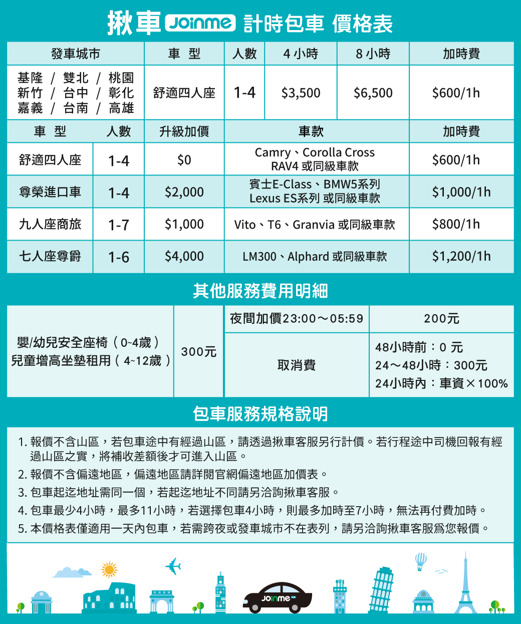 (4) 取消費用說明:若於出發前48至24小時內,取消已預約訂單,將收取300元取消費,24小時內取消,將收取100%車資。
