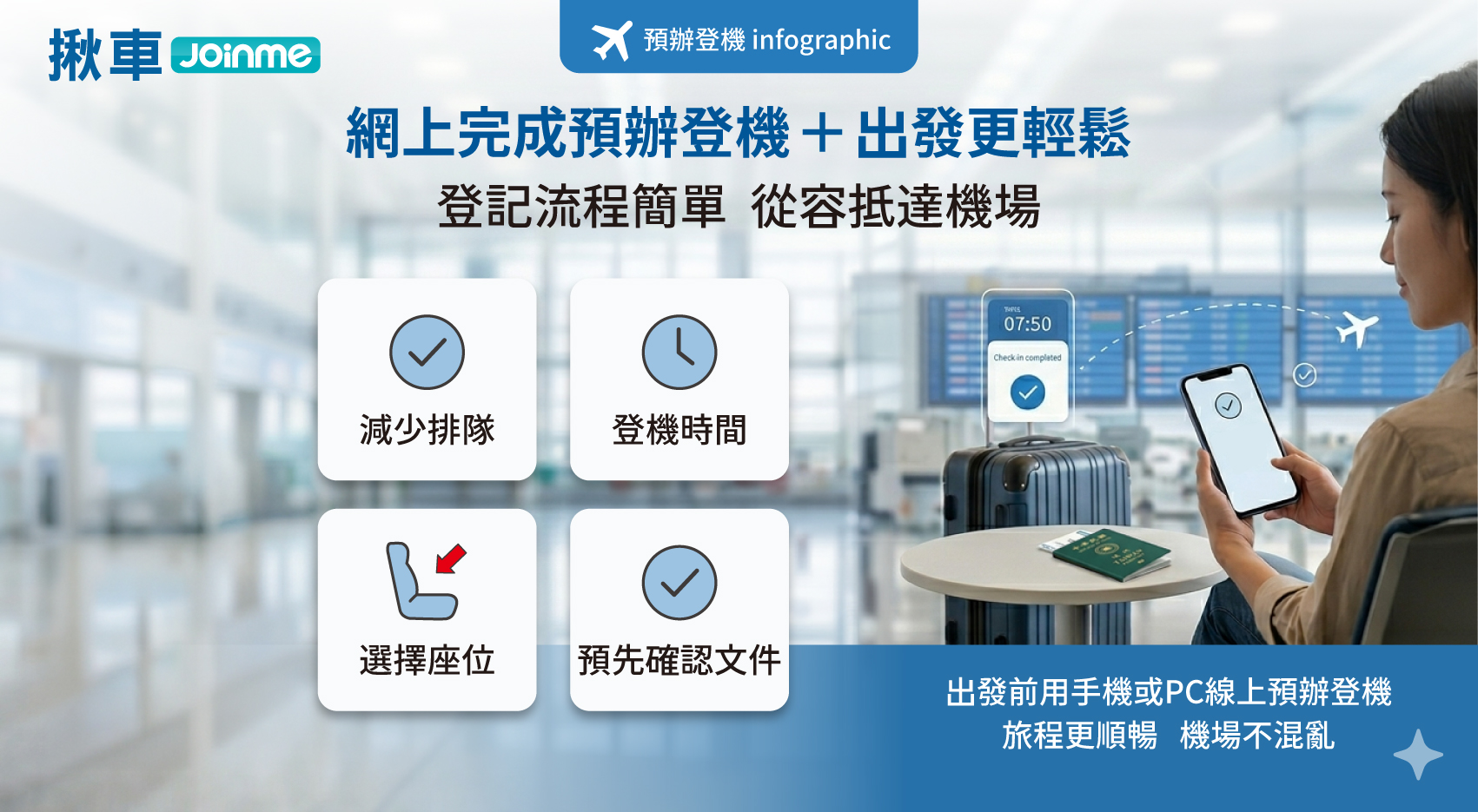 對很多台灣旅客來說,出國最容易出狀況的時刻,往往不是上飛機,而是到機場後才開始確認報到時間、櫃檯位置、座位安排與證件資料。如果可以先完成 航空公司預辦登機,通常就能提前確認旅客資料、處理選位,部分情況下還可直接取得電子登機證,讓到機場後的流程更順。